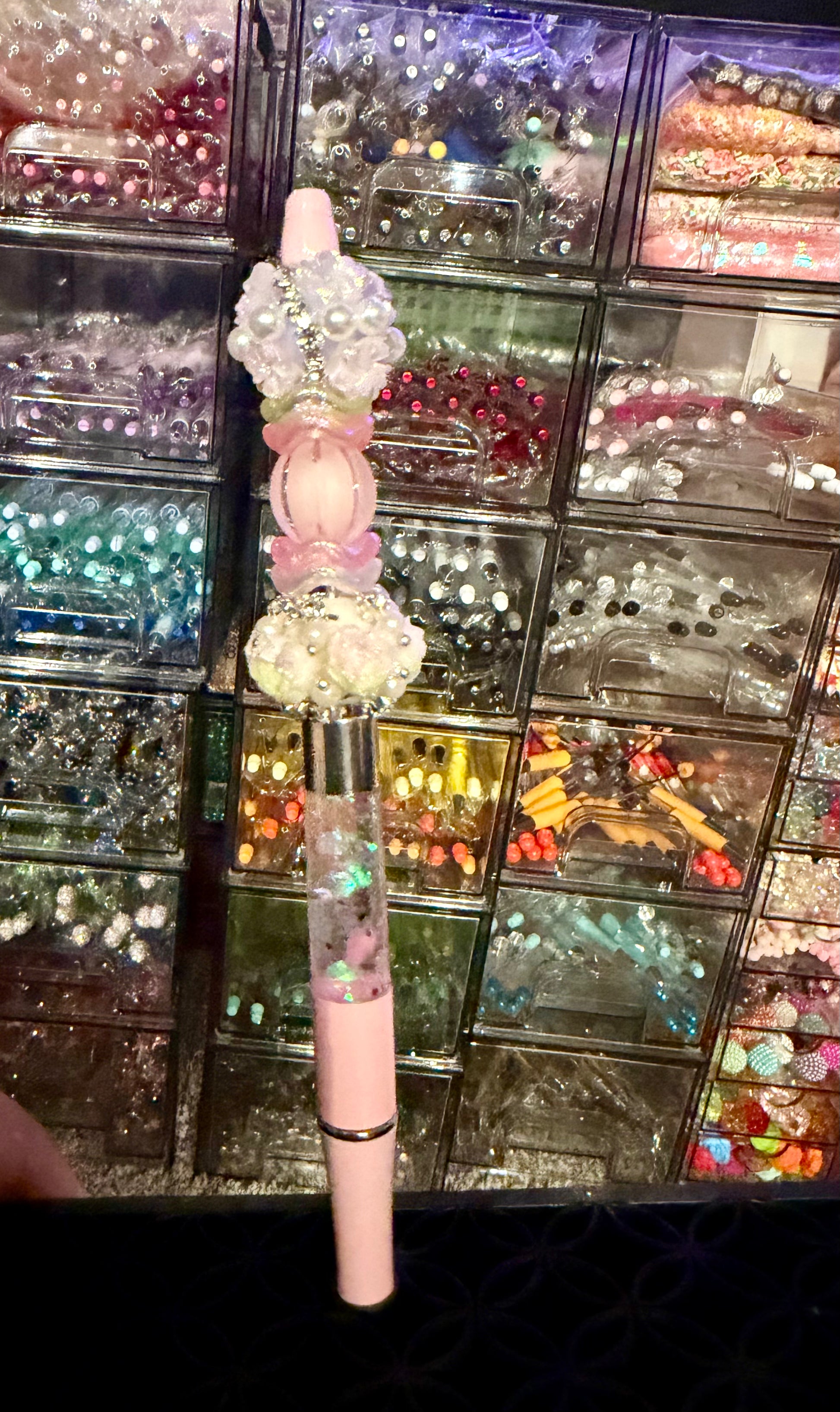 The beaded pen features a dual design, incorporating both a functional writing instrument and a decorative snow globe effect within its midsection. This unique combination allows for practical use while offering a visually stimulating element, appealing to those who appreciate both utility and aesthetic charm in everyday items.